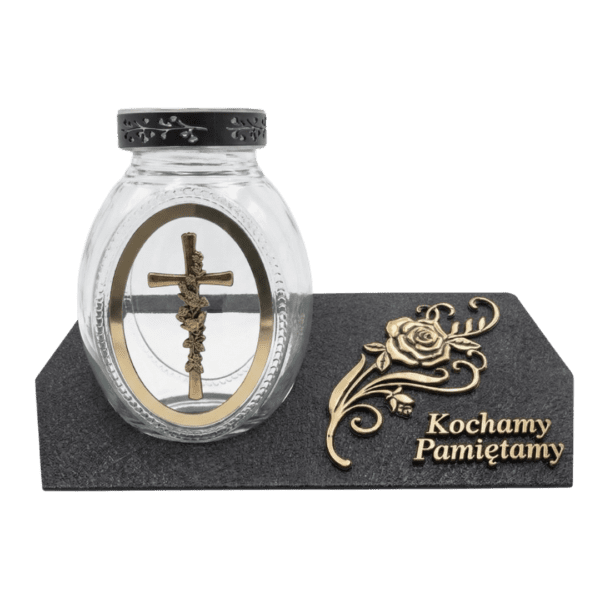Całość lampionu spoczywa na solidnej, ciemnej podstawie o strukturze do złudzenia przypominającej naturalny kamień. Podstawę zdobi przestrzenna, kunsztowna róża w kolorze złota oraz wzruszający, tłoczony napis. Przemyślana konstrukcja z szerokim spodem oraz ażurowym, czarnym kapturkiem nie tylko doskonale prezentuje się na płycie nagrobnej, ale również gwarantuje bardzo wysoką stabilność podczas jesiennych i zimowych wiatrów. Znicz jest w pełni uniwersalny – przystosowany do wkładów parafinowych, olejowych oraz nowoczesnych rozwiązań elektrycznych.