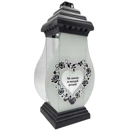 Znicz Szklany Napoleon „Na zawsze w naszych sercach” to poruszający i elegancki lampion nagrobny o wysokości 39,5 cm. Przód znicza zdobi efektowny motyw serca w otoczeniu czarnych róż oraz wzruszający napis, który przypomina o trwałej pamięci o bliskich. Zastosowane lustra na dnie i z tyłu znicza intensyfikują światło płomienia, tworząc nastrojową aurę głębi i refleksji. Znicz wykonany został z wysokiej jakości szkła i tworzywa, co zapewnia mu trwałość i odporność na warunki atmosferyczne.