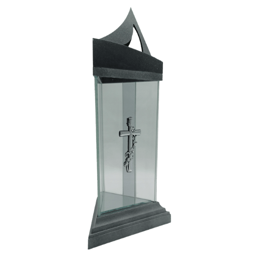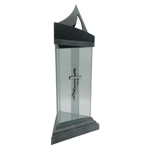 Znicz Szklany Trójkąt to nowoczesny i elegancki lampion nagrobny o geometrycznym kształcie. Wykonany z przezroczystego szkła i trwałego tworzywa sztucznego, ozdobiony dekoracyjnym krzyżem na froncie. Prosta, a jednocześnie efektowna forma sprawia, że znakomicie prezentuje się na nagrobku, będąc godnym symbolem pamięci o bliskich.