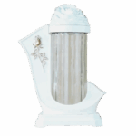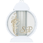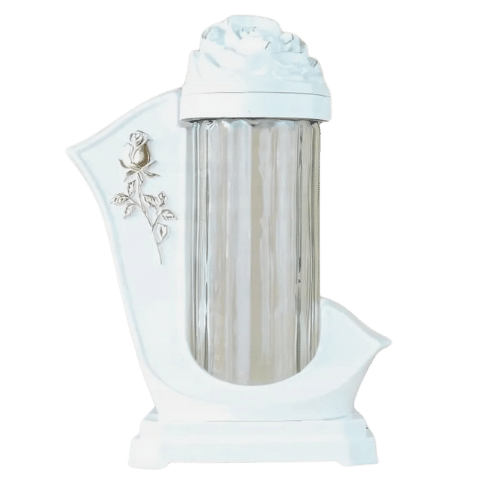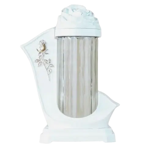 Znicz Wstęga Biały to dekoracyjny lampion nagrobny o nowoczesnej i eleganckiej formie. Wykonany z trwałego szkła i tworzywa sztucznego, wyróżnia się subtelną kolorystyką oraz ozdobnym motywem złotej róży. Dzięki solidnemu wykonaniu i klasycznemu kształtowi doskonale prezentuje się na każdym nagrobku, stanowiąc symbol pamięci i szacunku wobec bliskich.