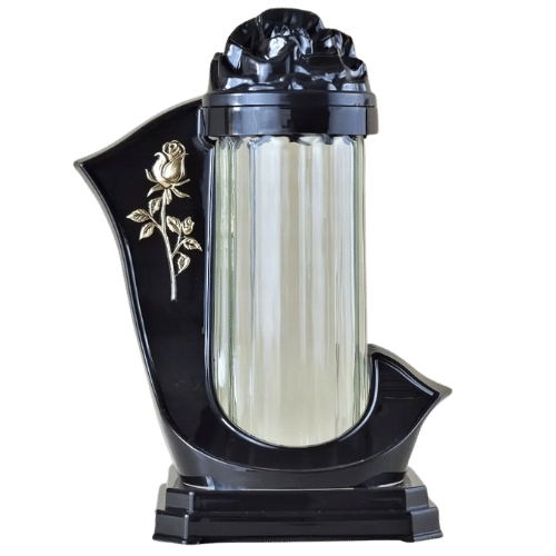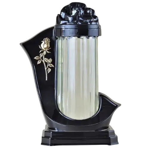 Znicz Wstęga w kolorze czarnym to elegancki model o nowoczesnej formie, zdobiony subtelnym motywem złotej róży. Wykonany z połączenia szkła i tworzywa sztucznego, łączy wyrazisty design z trwałością, tworząc piękną dekorację nagrobną.