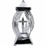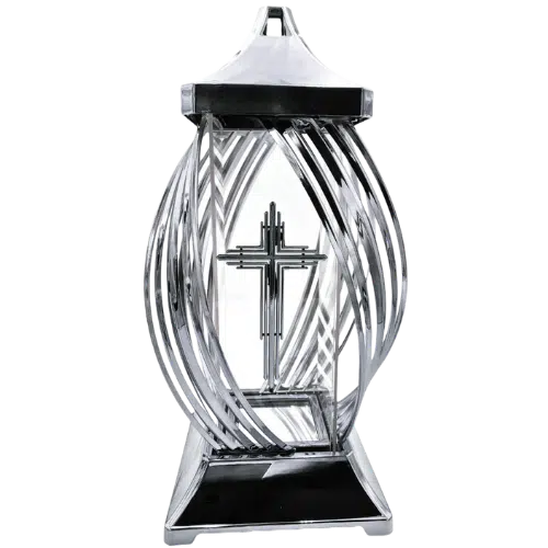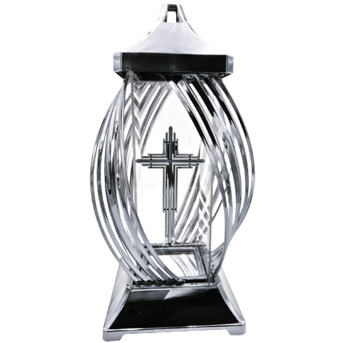 Znicz Szklany Wstęga Krzyż Srebrny to okazały i elegancki lampion nagrobny, który wyróżnia się nowoczesnym kształtem oraz symbolicznym wykończeniem. Wykonany z trwałego szkła i tworzywa, ozdobiony jest srebrną metalizacją i dekoracyjnym krzyżem w centralnej części. To idealny sposób na godne upamiętnienie bliskich i wyrażenie szacunku.