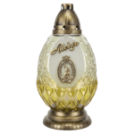 Znicz Szklany Jajko Wielkanocne Wianuszek “Alleluja” (33 cm) to niezwykle wymowna i klasyczna dekoracja nagrobna, stworzona by w godny sposób uczcić pamięć bliskich w czasie Świąt Zmartwychwstania Pańskiego. Lampion przykuwa uwagę formą tradycyjnego jajka – odwiecznego symbolu nowego życia. Wykonany został z masywnego, fakturowanego szkła, które zachwyca efektem ombre. Intensywnie żółty odcień u dołu łagodnie przechodzi ku górze w pełną przezroczystość, dzięki czemu płomień wewnątrz zyskuje ciepłą, kojącą barwę, a samo szkło wspaniale rozprasza światło.
